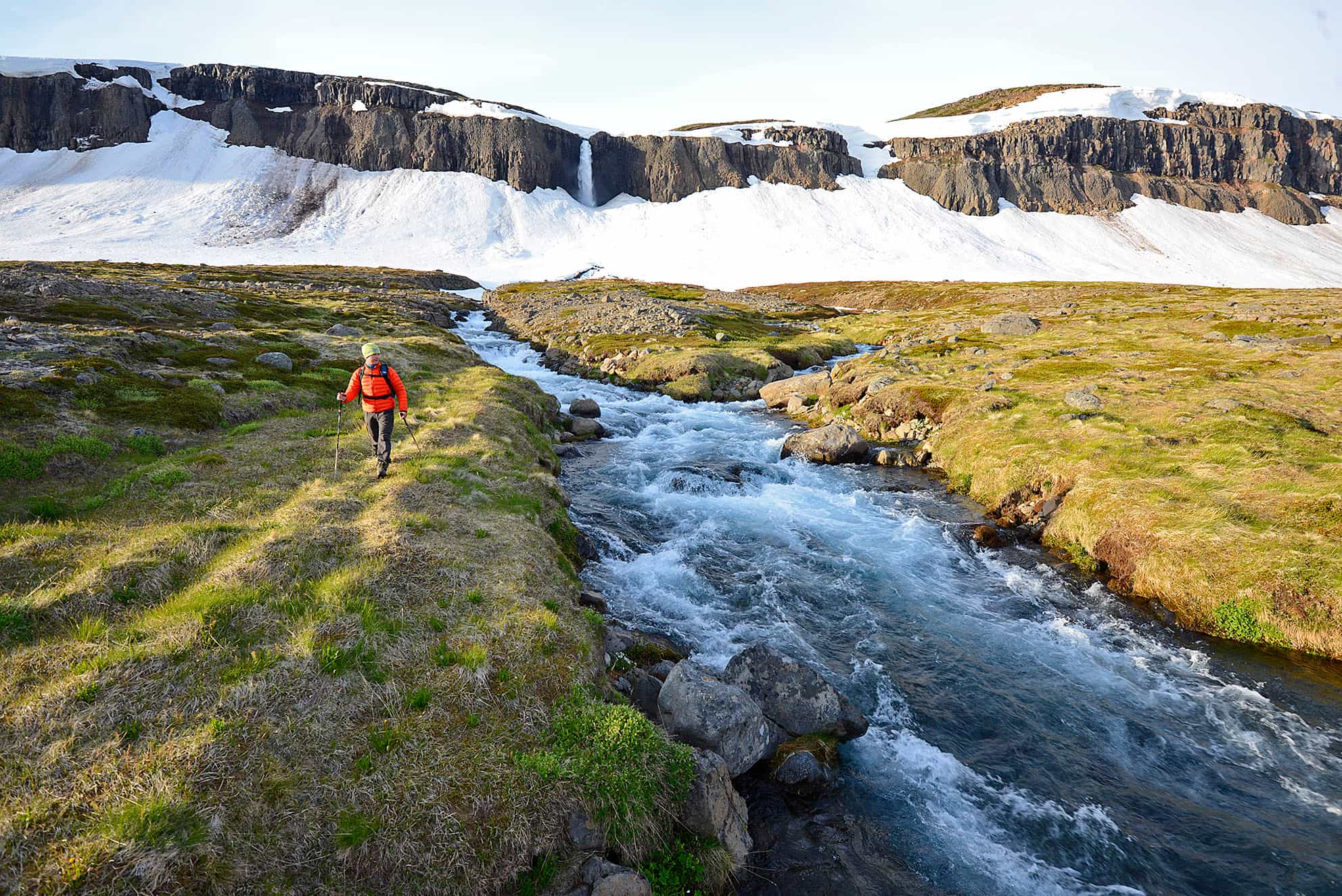 Rest your arms today as you switch to exploring on foot with a full day of hiking through a remote mountainous region. Following the shoreline of the fjord, you’ll pass the remains of abandoned farms from a bygone era when a few hardy souls attempted to eke out an existence here. Climb up through the glacial valley of Ytraskarð to see the remnants of the glacier before descending towards Möngufoss waterfall, a powerful torrent of water not far from camp. Enjoy your camp spot for another night with a well-earned slap-up meal.