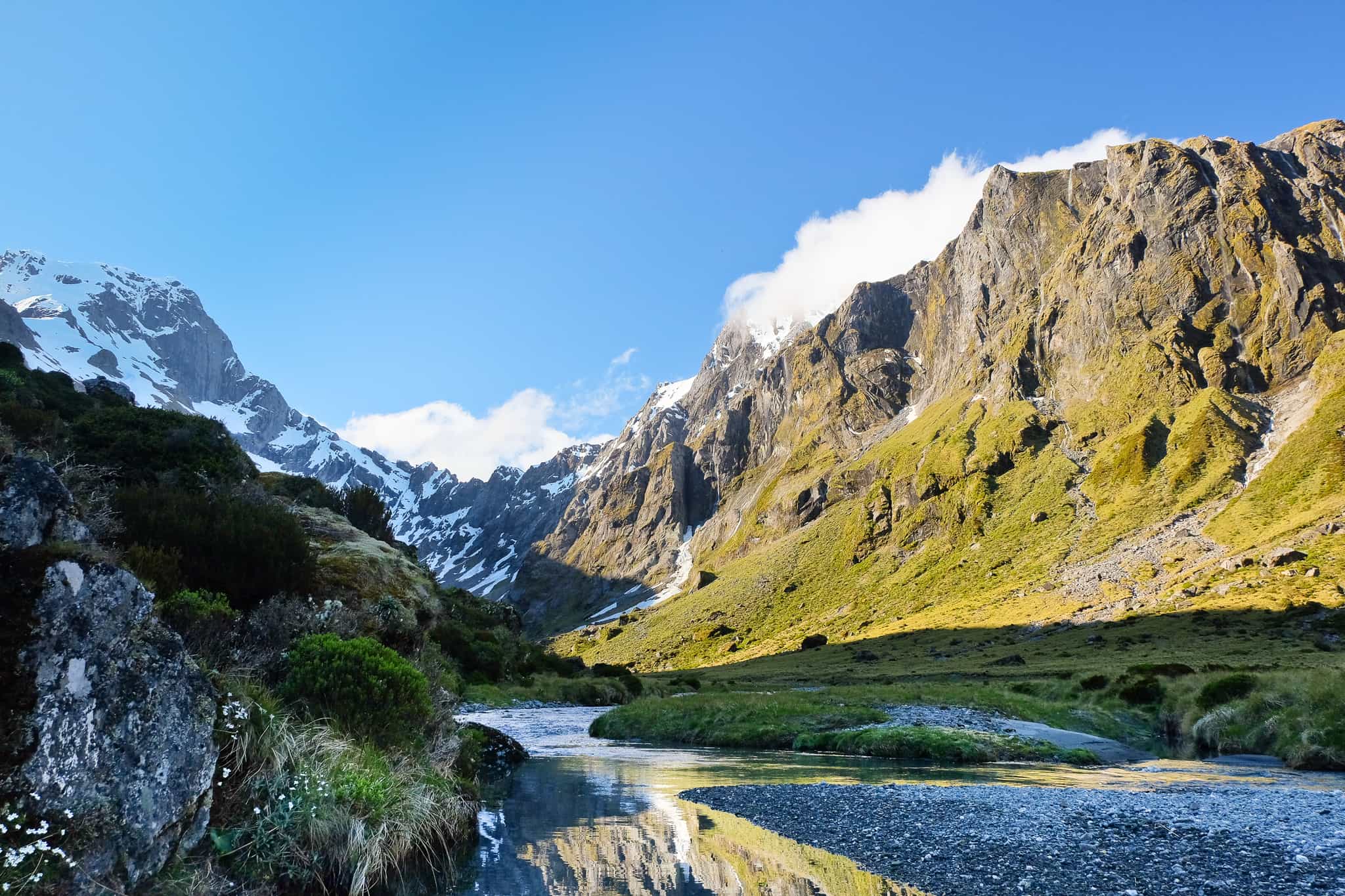 This morning the trail meanders its way up the valley sidewall beneath the imposing east face of Mount Awful. This section of the trek is right in the thick of a proper alpine paradise, with towering snow-capped mountains making a constant backdrop. 3-4 hours of alternating steep climbs and plateaus lead you to the Gillespie Pass and one of the great viewpoints of the Southern Alps with Mount Alba dominating the skyline. Descend steeply before sidling down through a series of snow grass basins down to Gillespie Stream and on switchbacking to Siberia Stream and finally Siberia Hut where you can rest up after an epic day.
