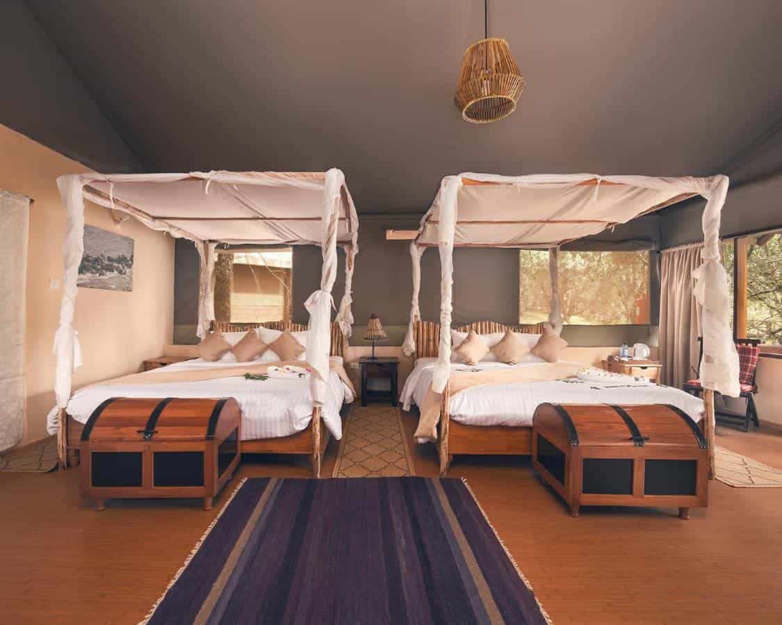 - Twin tents, camp beds, bedding and towels during the wild camping experience in Loita